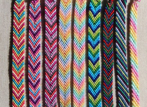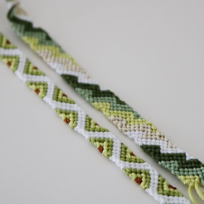 3. Помни, что, во-первых, нужно уложиться в подсчитанное количество рядов, а во-вторых, не начинай плести сразу от начала (первые ряды обычно немного кривые, да и сзади всё равно никто ничего не увидит), лучше проплети рядов 5 фоновым цветом. Сверху и снизу тоже лучше сделать «бортики» примерно из 2-3 узелка, так работа будет смотреться аккуратнее и гармоничнее. Фенечку можно сделать меньше, чем длина запястья человека, оставив достаточно большие завязки и покрыв это расстояние ими. Но вот больше будет смотреться уже не очень красиво.